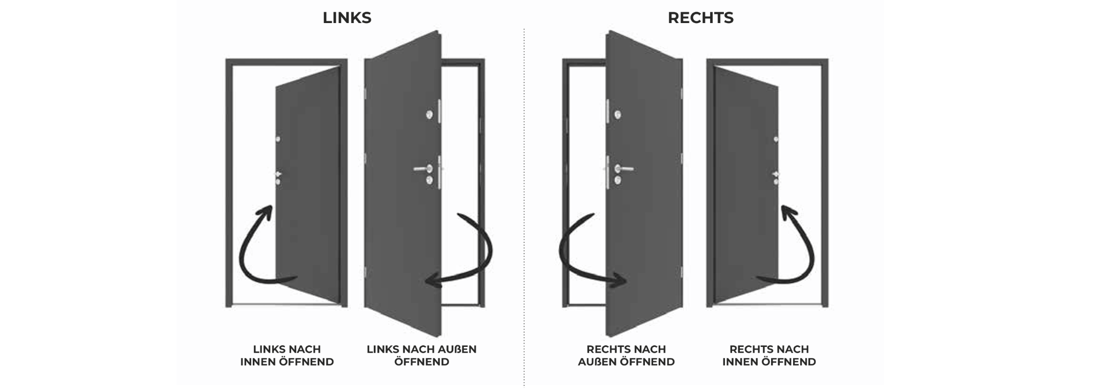 Das Bild zeigt eine Erklärung der DIN-Richtung für Türen. Es gibt zwei Hauptunterscheidungen: Links und Rechts, mit jeweils zwei Varianten: