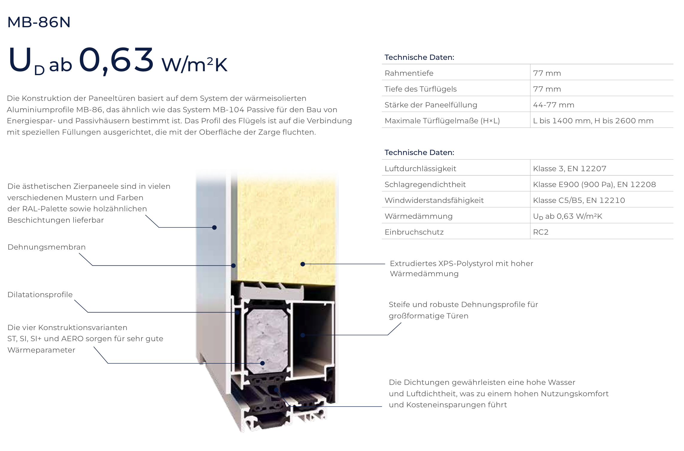 Moderne, elegante Haustüren mit hervorragender Wärmedämmung und Langlebigkeit. Auf Basis des Systems MB-86 gefertigt, verbinden sie innovative Technik mit ästhetischem Design. Dank vielfältiger Füllungen, Farben und Applikationen passen sie sich jedem Baustil an – ein funktionaler, repräsentativer und energieeffizienter Eingang für Ihr Zuhause.